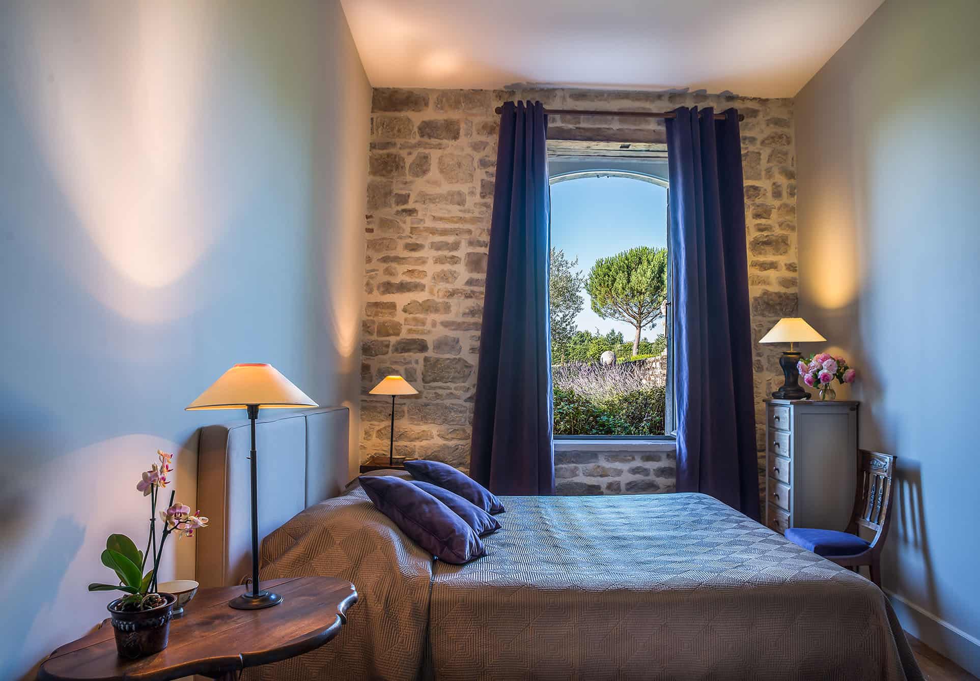 Au rez-de-chaussée, la CHAMBRE PRUNE d’une vingtaine de mètres carrés offre sa vue sur un des plus beaux oliviers centenaires du parc. Murs de pierre et tons clairs contrastés avec des rideaux de velours prune, son atmosphère est apaisante.
