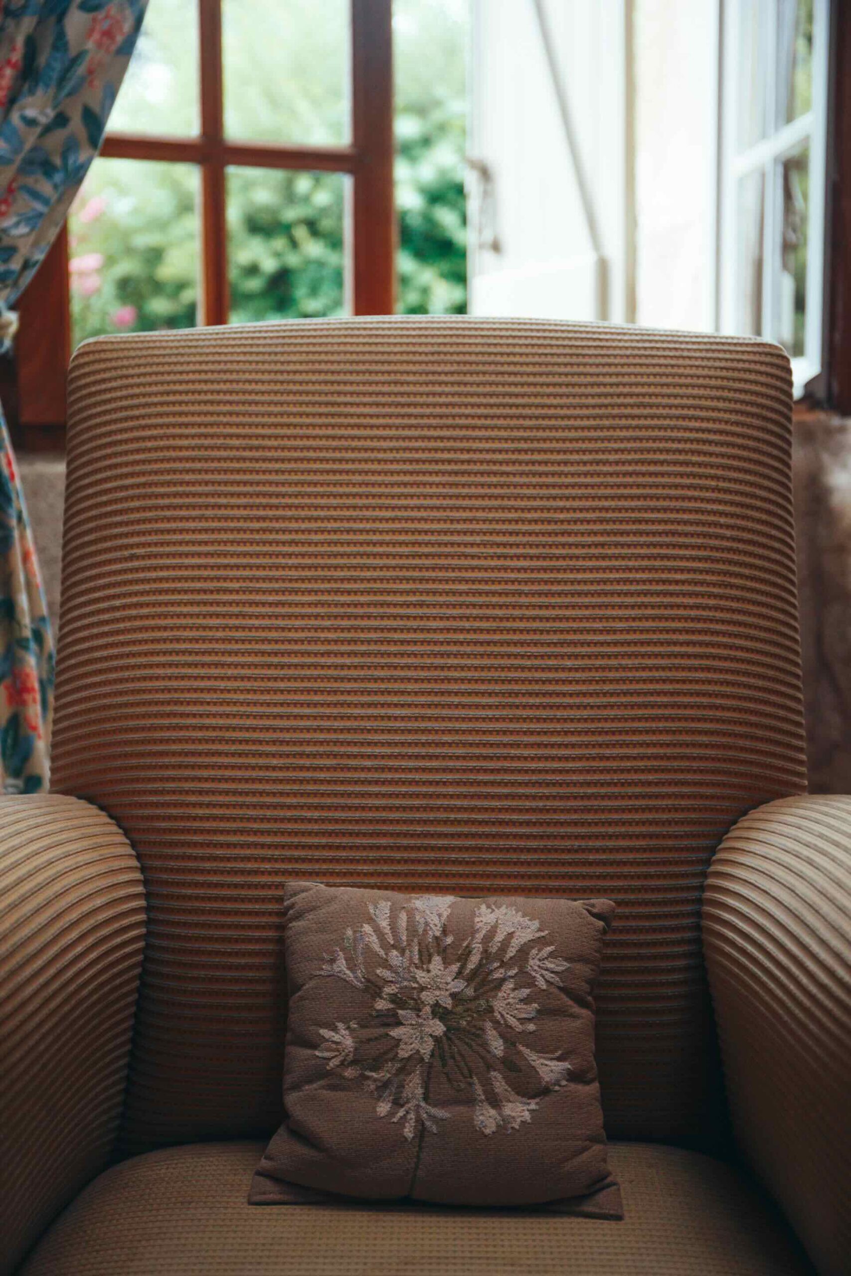 Au rez-de-chaussée, GRANDE CHAMBRE a deux fenêtres qui ouvrent sur le jardin. Tissus raffinés, meubles de famille, elle est décorée dans un esprit classique et offre un cadre apaisant. Téléviseur.