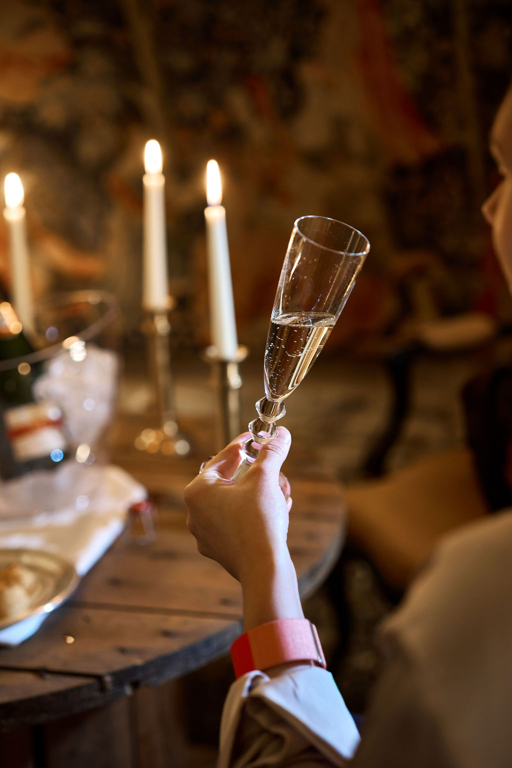 Un accueil au champagne servi dans une flûte de cristal,