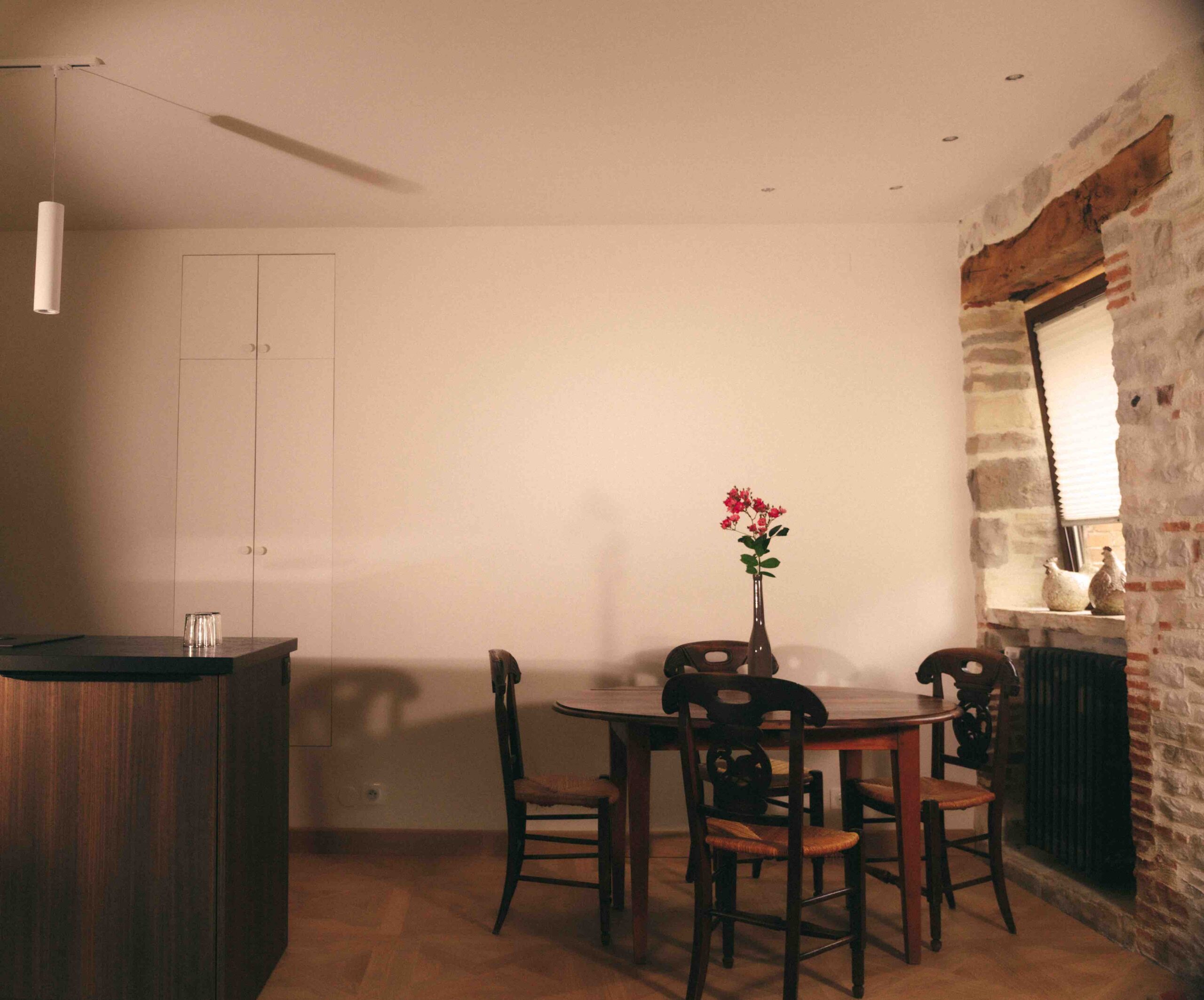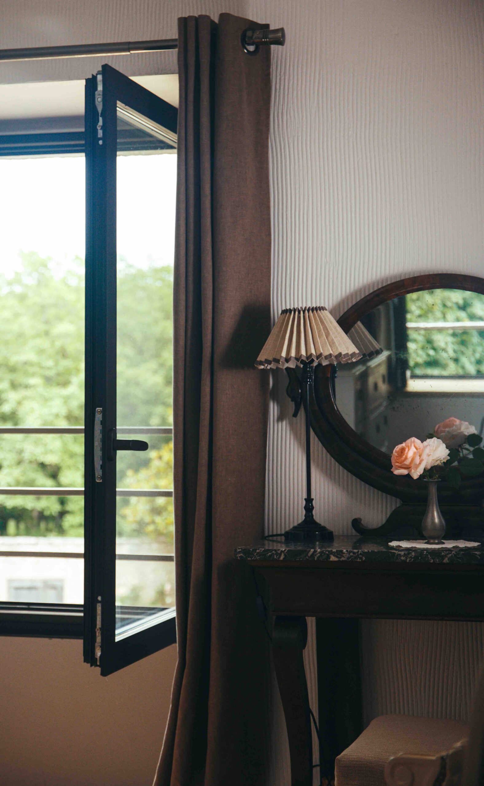 Ce duplex de 55 m² ouvre sur la grande cour. Il est attenant à la maison principale. Au rez-de-chaussée, le salon dans les tons vert d’eau est meublé d’un confortable canapé, d’une bibliothèque et d’un téléviseur. Le salon bien isolé est éclairé par deux fenêtres ouvrant sur la cour.